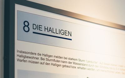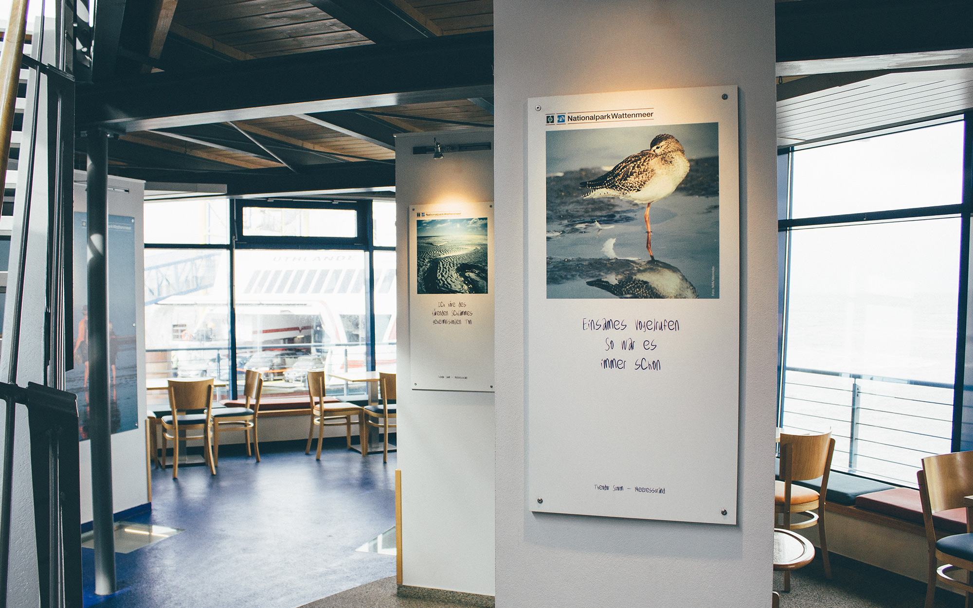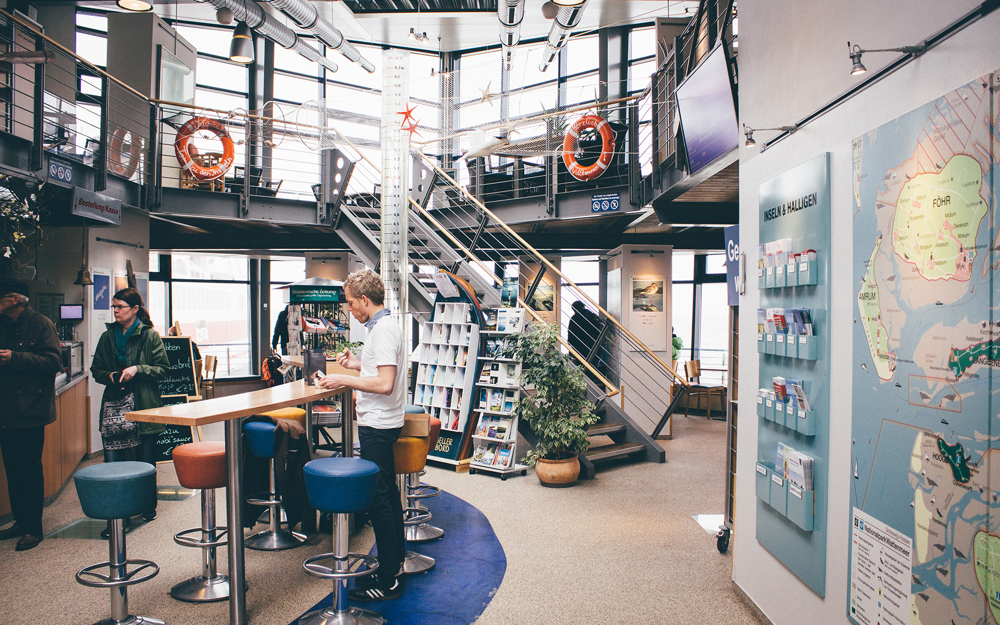 Was sind eigentlich Halligen? Und wieso ist der Deichbau hier an der Nordseeküste so wichtig? Acht große Infotafeln geben uns hier im Servicegebäude die spannenden Antworten. Außerdem lernen wir Theodor Storm kennen, der in seinen Gedichten und Erzählungen das Lebensgefühl an der Nordseeküste wie kein Zweiter eingefangen hat. Wir finden jede Menge Prospekte zu den Sehenswürdigkeiten in der Umgebung. Und wenn wir Fragen zum Wetter oder zur Überfahrt haben, steht uns das freundliche Bistro-Team jederzeit gerne mit Rat und Tat zur Seite. Kurz: Wir fühlen uns rundum gut betreut.
