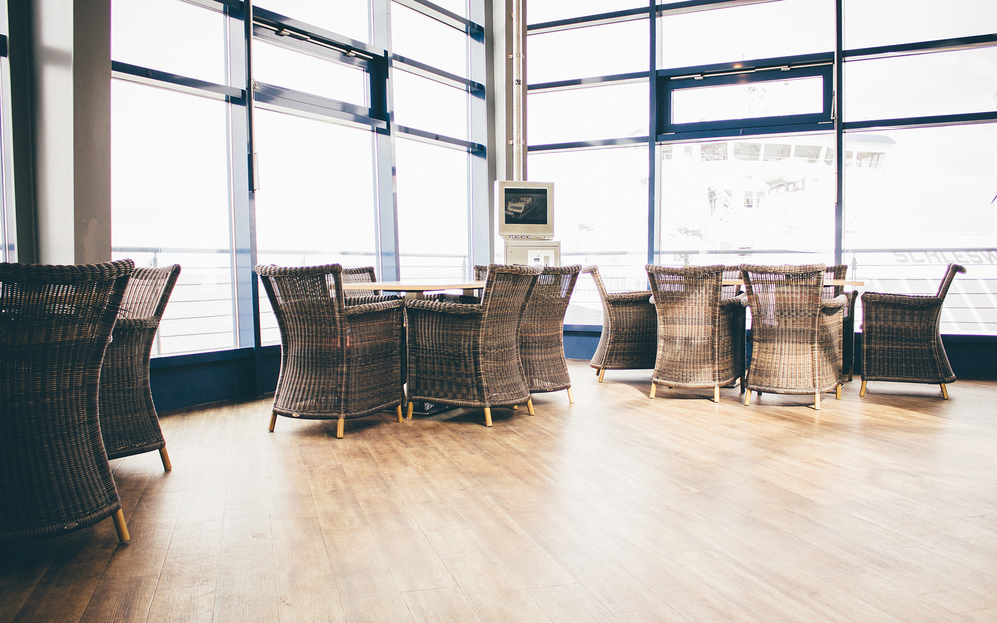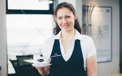 Maritimer geht's kaum: Wir sitzen über dem Wasser und genießen einen tollen Ausblick auf den Hafen und das Meer. Manch ein Gast zückt da schon mal das Ticket und fragt nach der Abfahrtszeit. Aber keine Sorge: Das Bistro bleibt, wo es ist. Und das Service-Team um Chefin Mandy Möller verwöhnt uns mit köstlichen Leckereien und Spezialitäten aus der Region. Ob Matjesbrötchen oder Backfisch, Currywurst mit Pommes oder Frikadellen: alles wird frisch zubereitet. Und egal, wann unsere Fähre ablegt – im Bistro sind wir zu jeder Uhrzeit herzlich willkommen. Denn die Öffnungszeiten orientieren sich an den aktuellen Fahrplänen.
