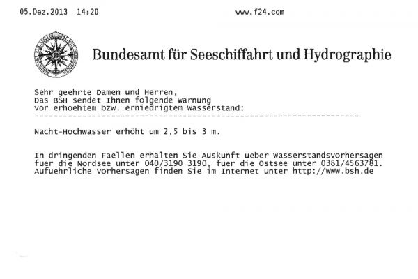 Es fängt ganz harmlos an - mit einer kurzen Zeile vom Bundesamt für Seeschifffahrt und Hydrographie, die per Fax und SMS beim Hafenmeister landet. Eine Zeile, die es allerdings in sich hat:
